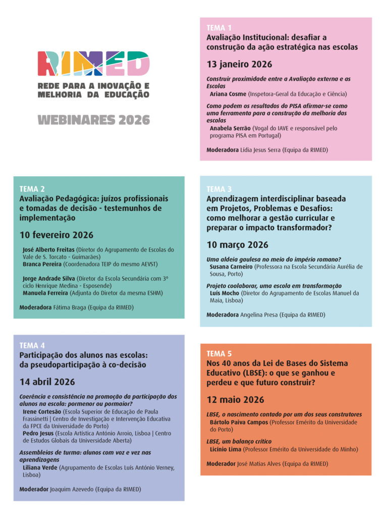 A RIMED (Rede para a Inovação e Melhoria da Educação) promove, em 2026, um novo Ciclo de Encontros RIMED na Web – Coconstruir roteiros para a inovação escolar III, desta vez suportado, em grande parte, no trabalho desenvolvido pelas RedesRIMED, que são plataformas horizontais colaborativas entre professores e escolas, dedicadas a partilhar experiências e a pensar e pôr em prática dinâmicas de inovação educacional nos vários domínios escolhidos pelos membros da Rede. Para concluir este ciclo celebraremos os 40 anos da Lei de Bases do Sistema Educativo, um importante marco na orientação das políticas educativas no nosso país.