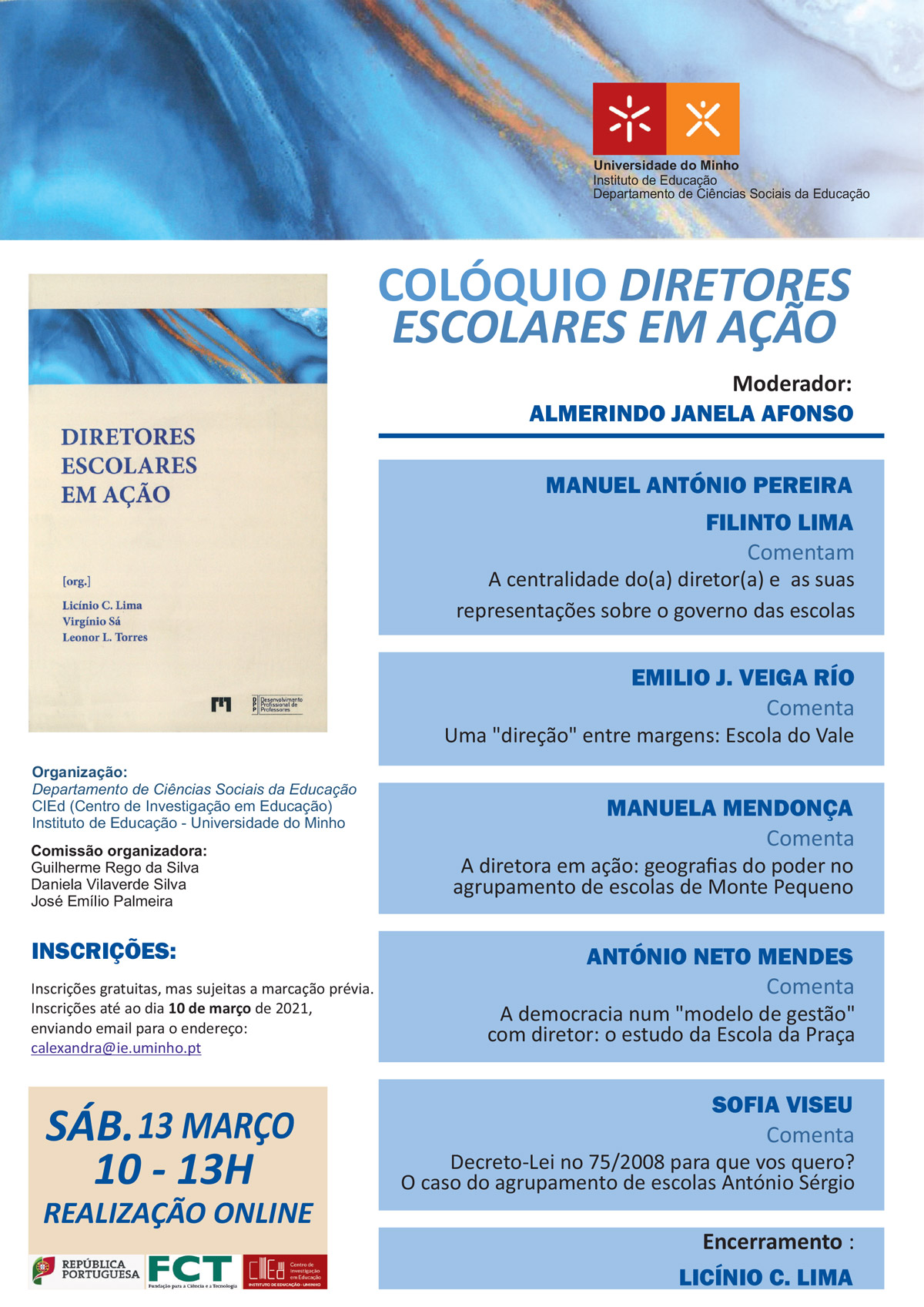 O Departamento de Ciências Sociais da Educação, do Instituto de Educação da Universidade do Minho realizará um Colóquio de divulgação da obra “Diretores Escolares em Ação. A iniciativa vai ter lugar no próximo dia 13 de março, entre as 10h e as 13h, por videoconferência” e contará com diversos especialistas convidados que comentarão cada um dos capítulos da obra.