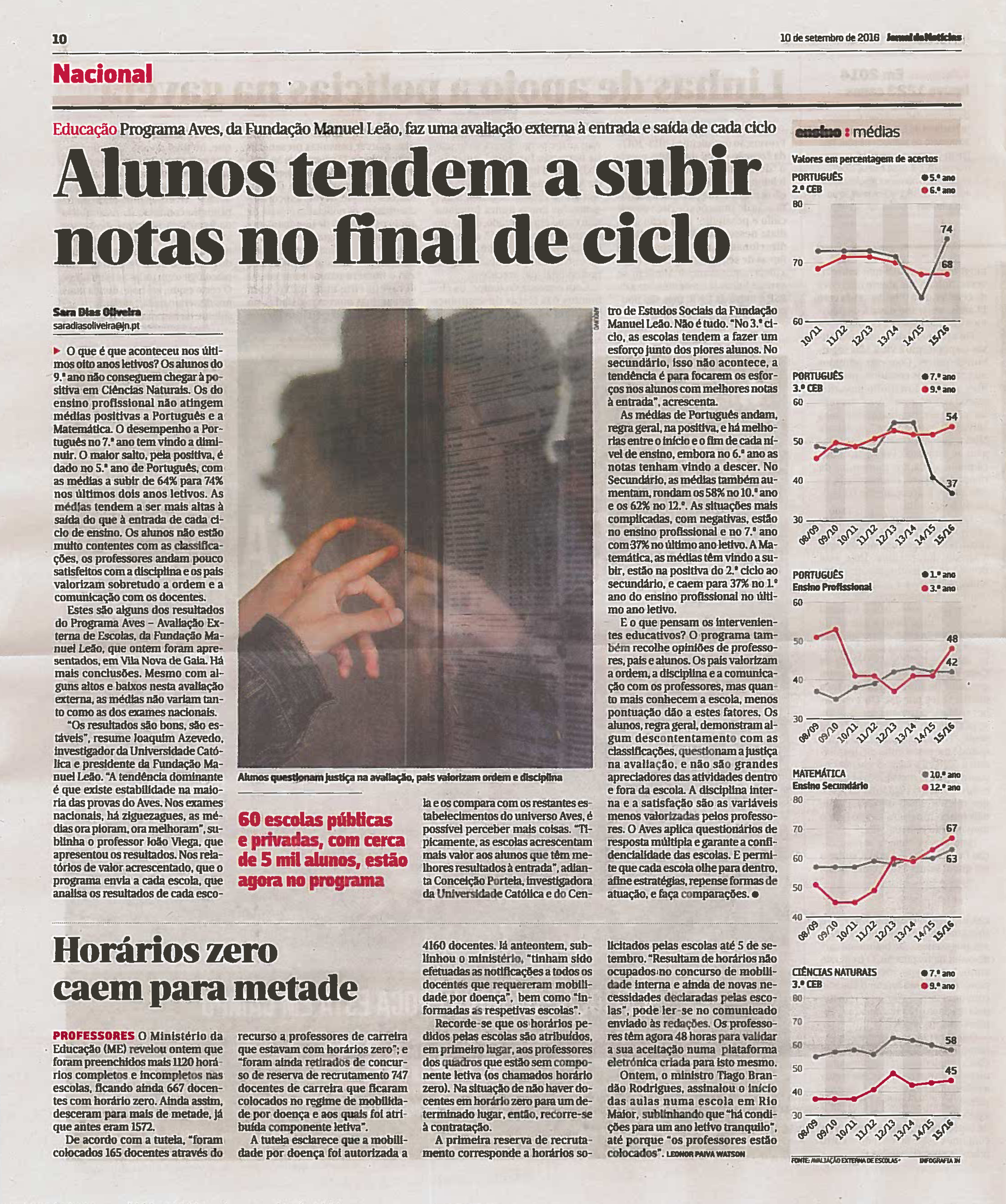 No dia 9 de Setembro foram apresentados os principais resultados do Programa AVES (Avaliação Externa de Escolas), da Fundação Manuel Leão. Nas palavras do coordenador geral do Programa de Avaliação Externa de Escolas, Professor Joaquim Azevedo, os resultados revelam uma “tendência dominante” de “estabilidade na maioria das provas do AVES”. Nos exames nacionais há ziguezagues, as médias ora pioram, ora melhoram. Foi possível verificar que as escolas acrescentam mais valor aos alunos que têm melhores resultados à entrada. Para saber mais clique aqui.
